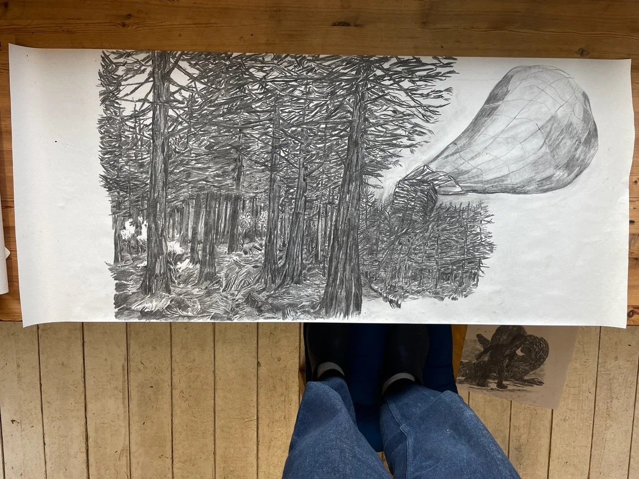 In some of the drawings I made here, you remain a spectator. In others, you are allowed to "step in." If you can enter the drawing, it’s more exciting, especially in the one with the trees, the path, and the fence. The skin of the night seems more porous. Things have no hard boundaries. In truth, the world doesn’t consist of separate elements. It’s such a shame that our time, or the West, sees everything as separate. I’d like to let go of that. Illustrations for children’s books rarely contain unclear interstices—everything has to be clear because children like that. Is that really the case? I’m going to let it go. Add more things that raise questions and create situations on paper where the answer isn’t immediately given.